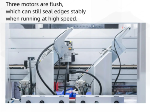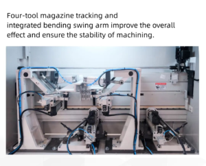 Pre-spraying → pre-milling → preheating lamp 1→ gluing 1 (without cleaning the glue pot) → single-channel tape feeding 1→ six-wheel pressing 1→ preheating lamp 2→ gluing 2 (with quick sol) → single-channel tape feeding 2→ six-wheel pressing 2→ three-motor trimming → fine repair 1→ fine repair 2→ four-knife tracking → edge scraping 1 (anti-adjustable knife for directional wire blowing) → edge scraping 2→ flat scraping→ Spray Clean Agent→ Buffing 1&2